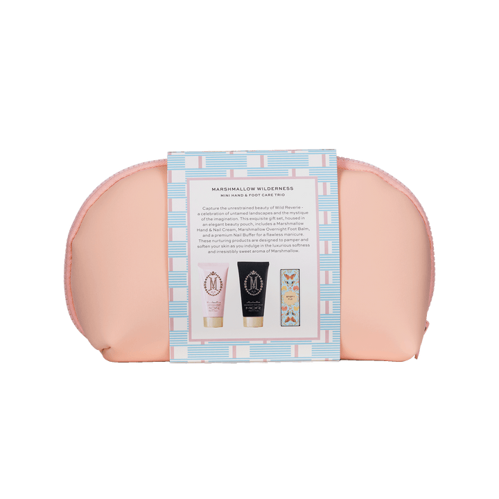 This exquisite gift set, housed in an elegant beauty pouch, includes a Marshmallow Hand Cream, Marshmallow Overnight Foot Balm, and a premium Nail Buffer for a flawless manicure. These nurturing products are designed to pamper and soften your skin as you indulge in the luxurious softness and irresistibly sweet aroma of Marshmallow.