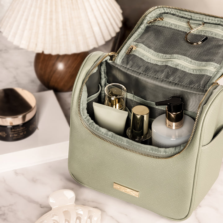 With two outer side pouches, exterior zip pocket, and a top handle for easy carrying, it opens to reveal a thoughtfully designed interior, featuring two zip compartments, ten elasticised pouches, and hidden hook for hanging.